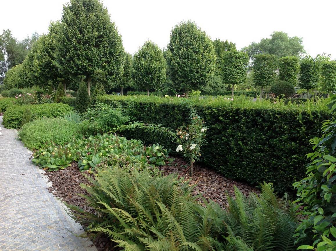 • Landschapstuin Hofstade Deze grote landschapstuin wordt gekenmerkt door een aantal lange zichtassen verkregen door paden, lanen en plantstroken. Rondom de woning is een gezellig terras aangelegd dat opgefleurd wordt met plantpotten. De beplanting is klassiek, witte rozen en hortensia's in combinatie met mauve tinten en groenstrukturen.