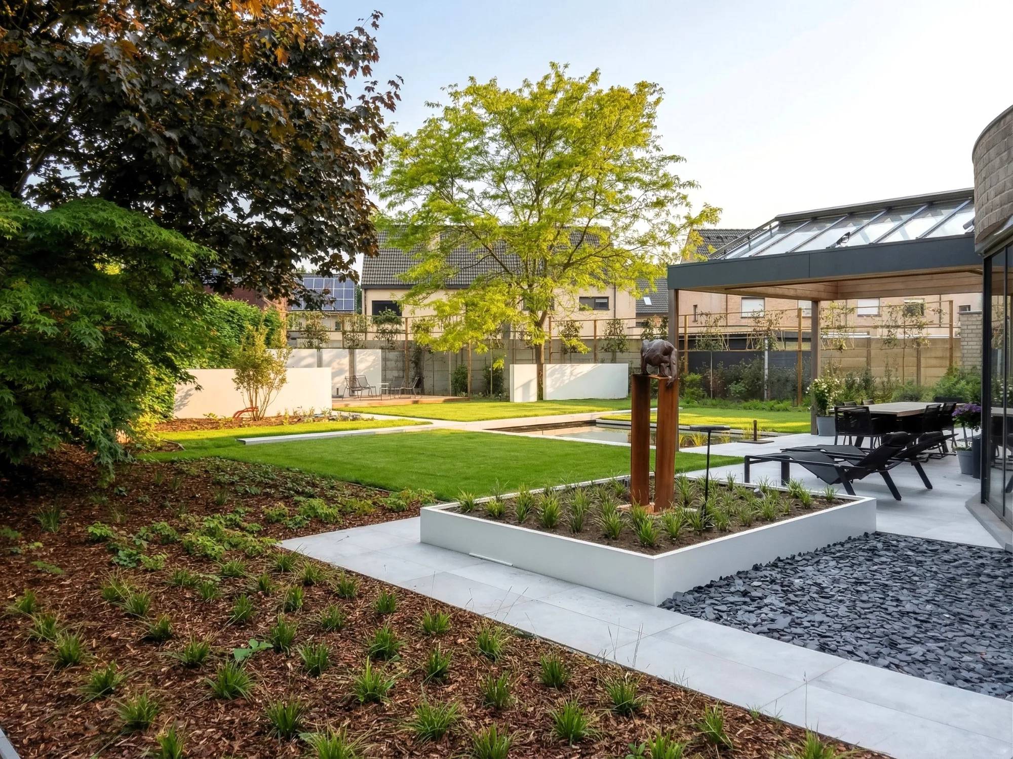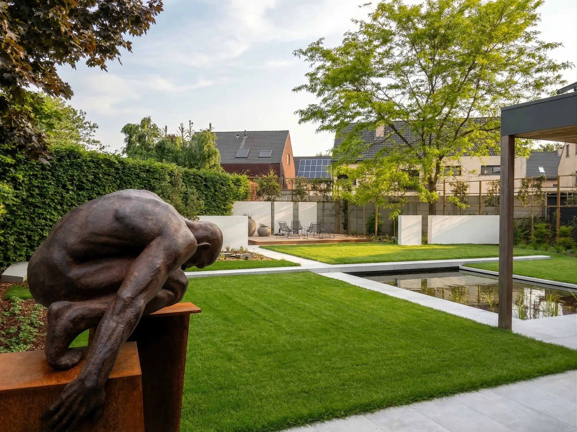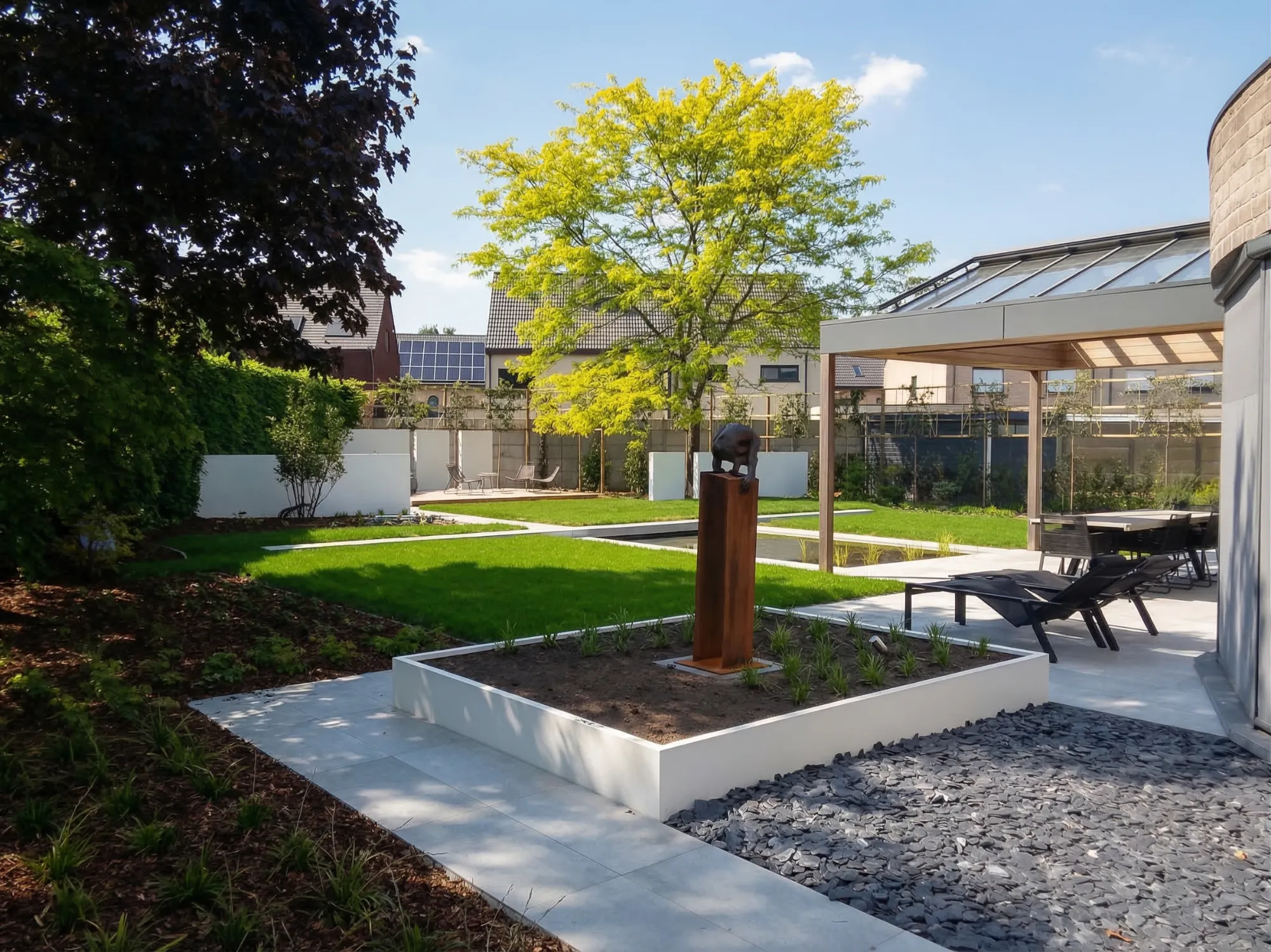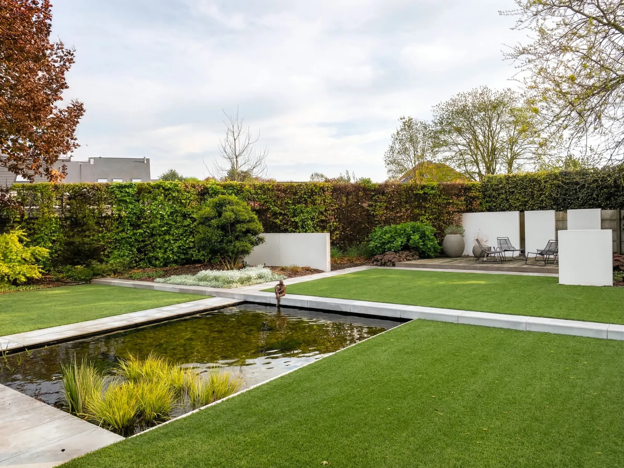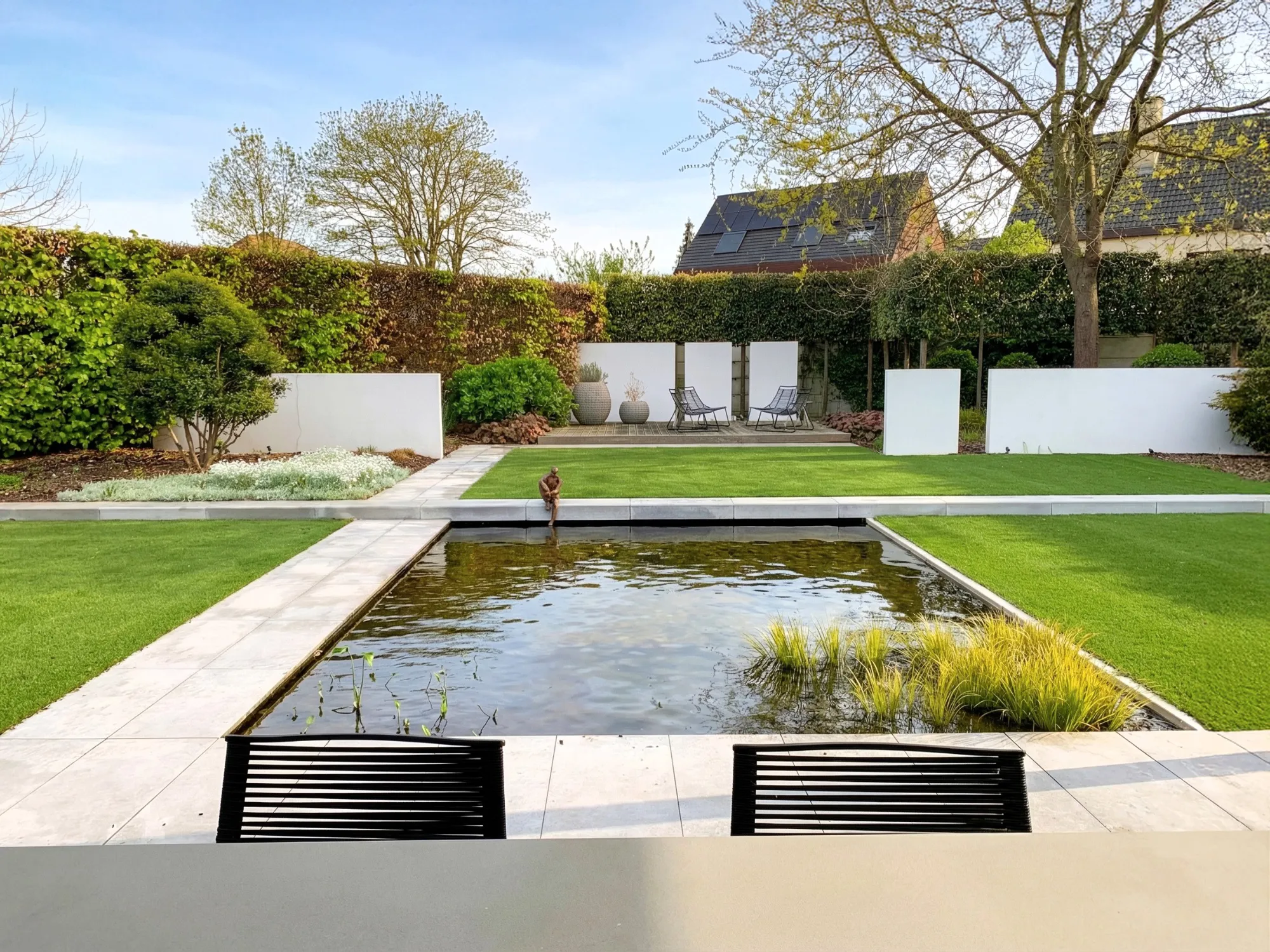 Dankzij een doordachte integratie van de vijver en een professionele tuinaanleg ontstaat een onderhoudsvriendelijke, stijlvolle tuin.
