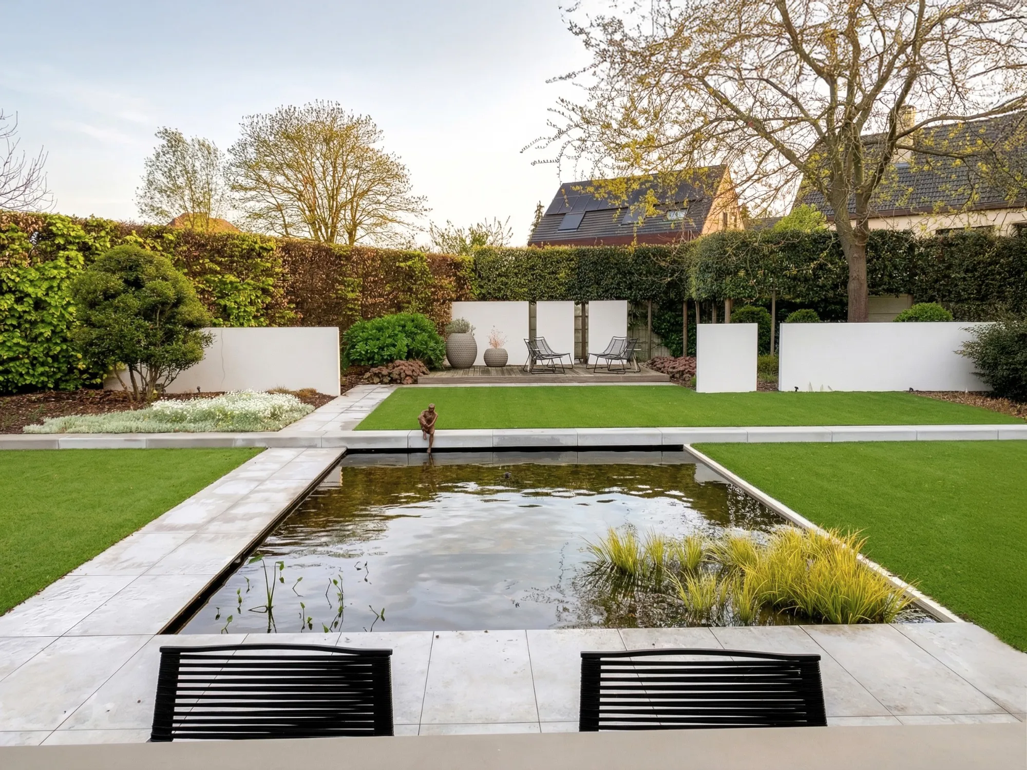 Deze tuin in Mechelen werd ontworpen als een strak en hedendaags geheel, waarbij de vijver fungeert als prominent architecturaal element.